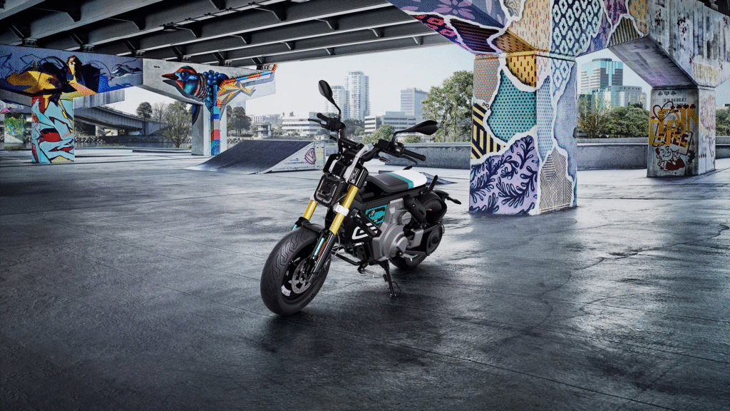 The BMW CE 02 is generally focused on the youth crowd, as demonstrated by its skateboard graphics and graffiti. BMW
