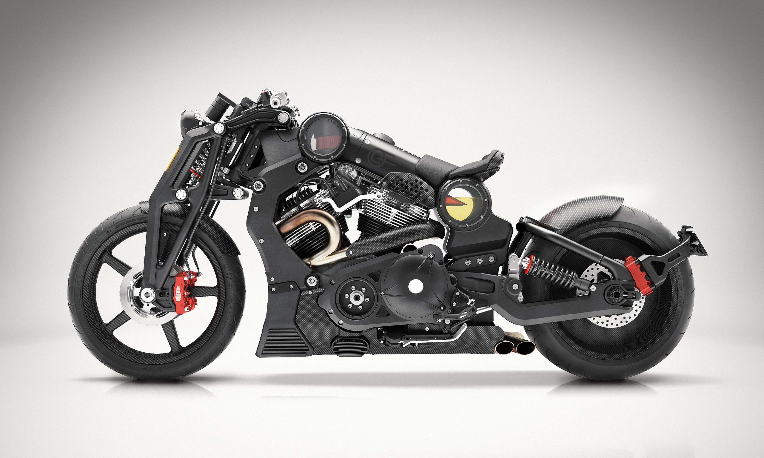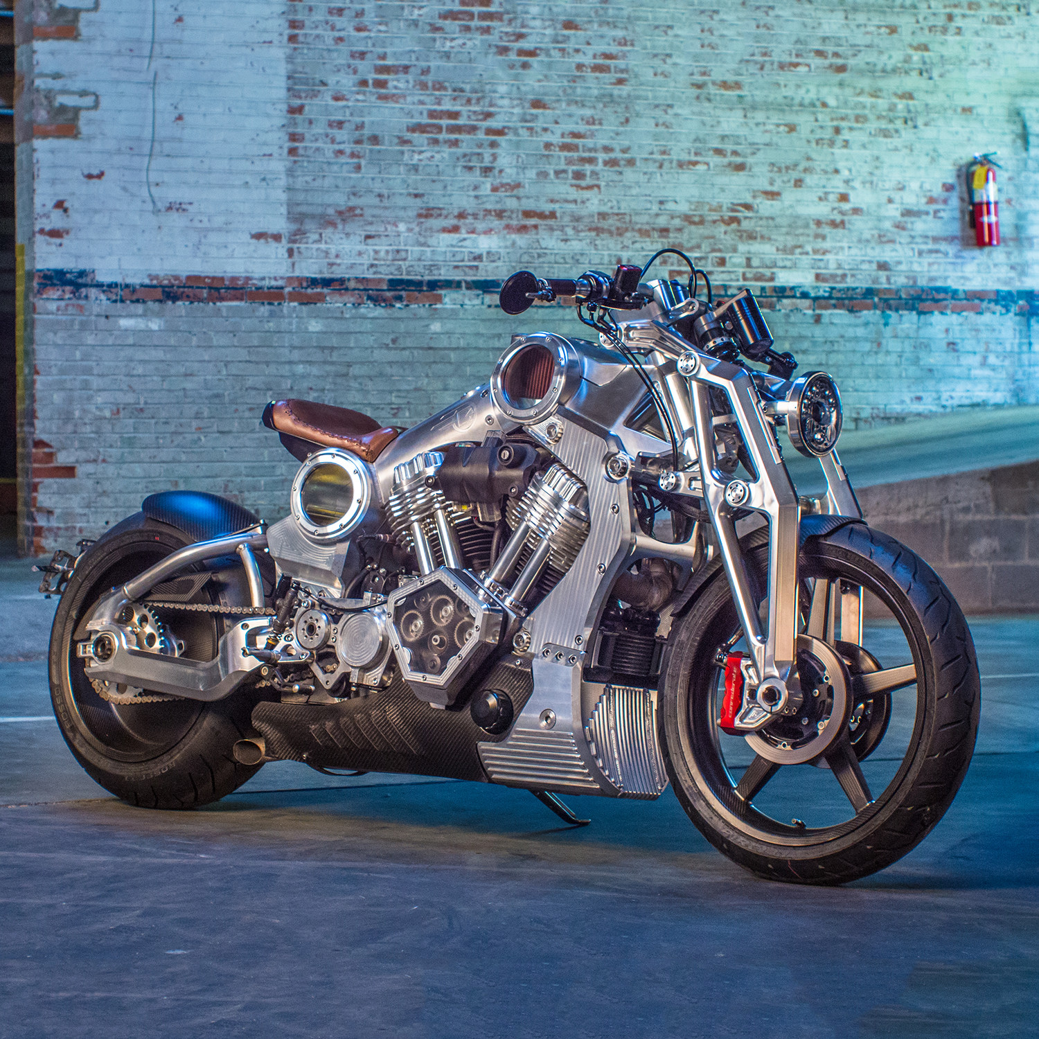- Machined aluminum monocoque, massive 7 in. backbone containing fuel load