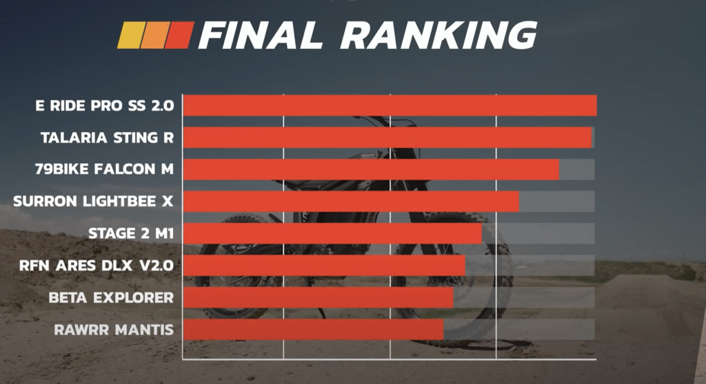 The testing process involved a thorough evaluation where four experienced riders, who had varying skills in mountain biking and motocross, rode each bike. They rode the bikes on different terrains and weather conditions, and then gave scores according to their personal impressions on factors such as power, handling, and total performance.