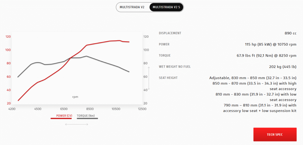 The backbone of the Multistrada V2 is its sturdy engine of 890cc, it is a 2-cylinder arrangement. This setup is capable of showing off an excellent rate of 113.9 horsepower and 10,750 RPM and producing a torque of 92.1 Nm at 8,250 RPM. Engine upgrades include the inevitable insect rods connecting and a new 8-disc hydraulic clutch. The results are the same with better performance, fewer problems, and a more enjoyable ride on the mountain terrain.